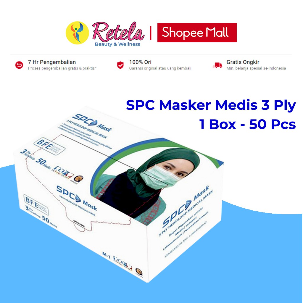SPC Masker Medis 3 Ply Headloop 1 Box isi 50 Pcs / Masker Hijab dijual oleh toko RETELA Official Shop yang berlokasi di KAB. TANGERANG.